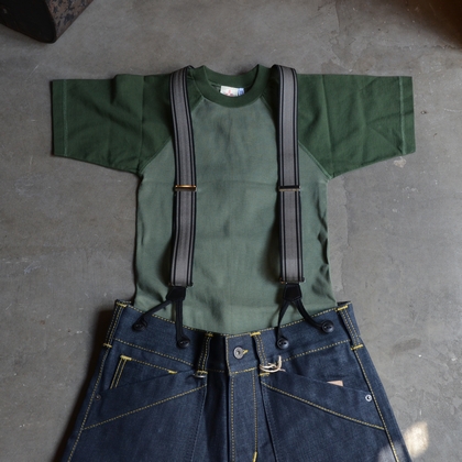 インナーにチョイ見せでミリタリー感をだしたり、サスペンダーを使いデニムパンツ等で合わせればより強靭な風合いを出しつつ一段とカッコ良さも引き立てるGREEN!またGREENとOLIVEのバイカラーとなっている所またオシャレなポイントです!