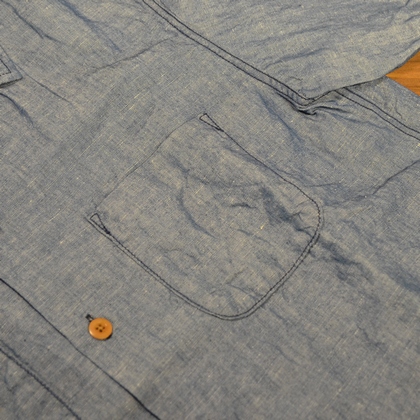 マテリアルにコットン60%、リネン40%を使用しタテ糸にコットン、横糸に上質なリネンを使用する事により、独特の光沢感とハリ感があり、より風合いを出すため、旧式の織機や昔ながらの染料を使用している為、永く着用する事で、糸本来の個性が生き、インディゴの色落ち感もお楽しみいただけます!首に束縛感が全く無いので、着ていてとっても快適な開襟シャツです!