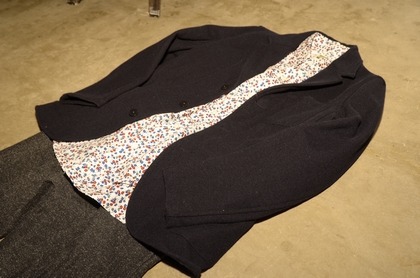 ウールジャケットで季節感を出して、ジャケット全体が暗くなりすぎないようフラワー柄のシャツを