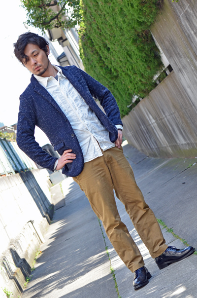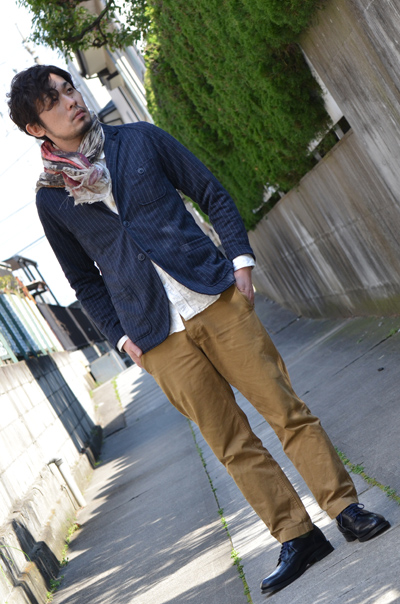 タイトシルエットのジャケットですので、タイトなシルエットのパンツと合わせて。