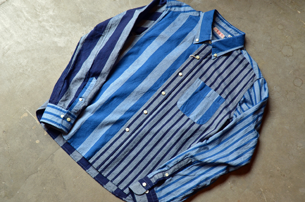 このシャツの特徴は、やはりインディゴを使用したストライプ生地に尽きるのではないでしょうか?