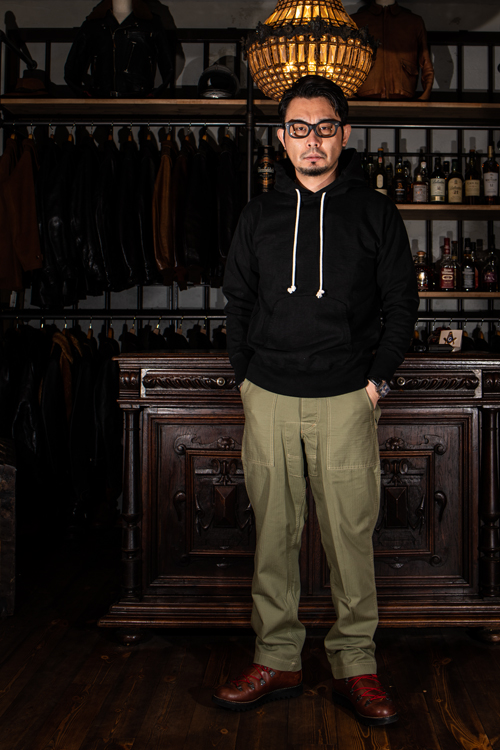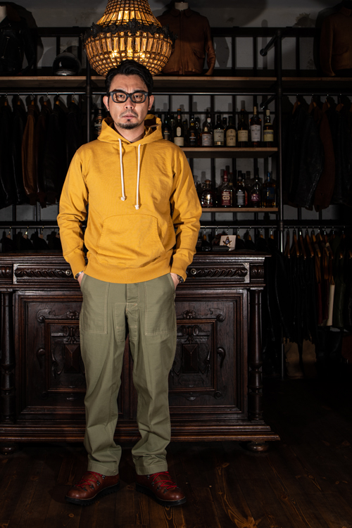 厚手のロンTのような着用感にパーカのルックスをプラスした一着です。