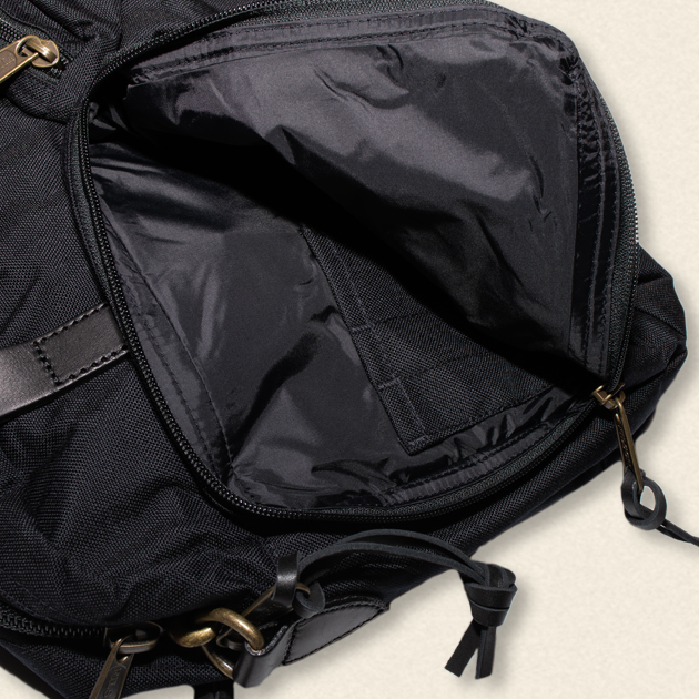 耐水・耐久性を高めるナイロンライニング仕様となっており、内部には15inchサイズまで収納可能なパッド入りPCポケット。