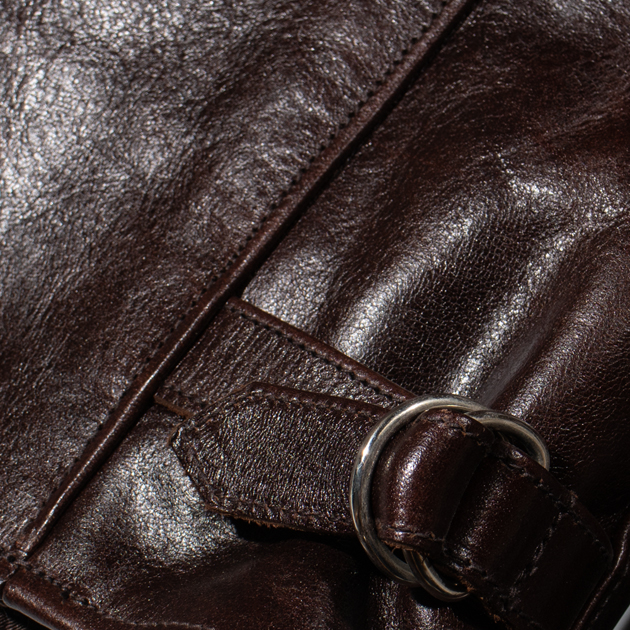 素材の馬革は茶色の下地を使用し、ブラックカラーは水性ラッカーで艶がありオイルっぽいタッチに、シールブラウンはアニリン(染料)によりムラのある仕上げにしている。