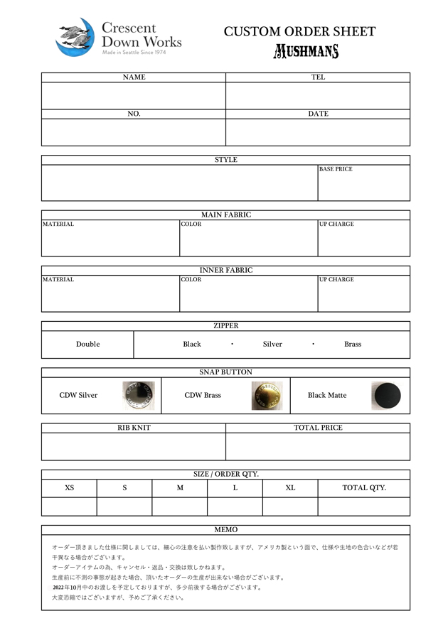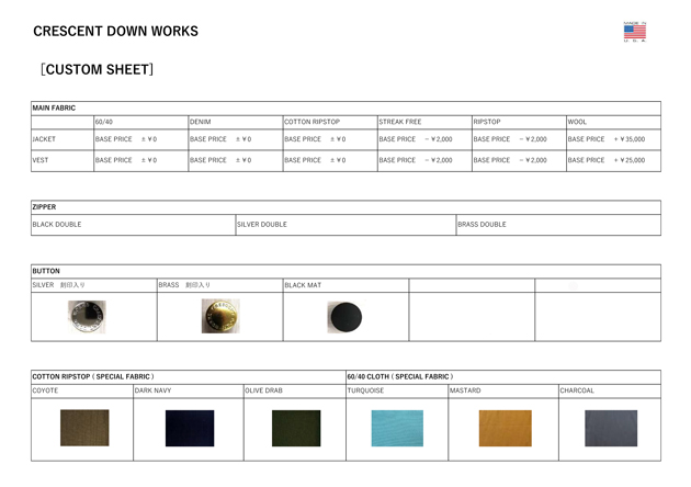 明日よりスタート! "Crescent Down Works"カスタムオーダー受注会!