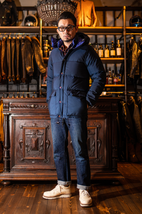 比較的スッキリと見えるシルエットですが、サイズ感には余裕がございます。かなりタイトに着用したい場合はSサイズでもイケるかもしれませんが、やはりダウンジャケットはある程度普通のサイズ感で着用いただいた方が良いかと思います。