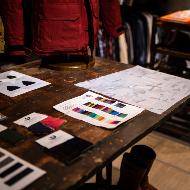 別注用ファブリック【Multi Cam® ALPINE】も実物を御覧いただけます。