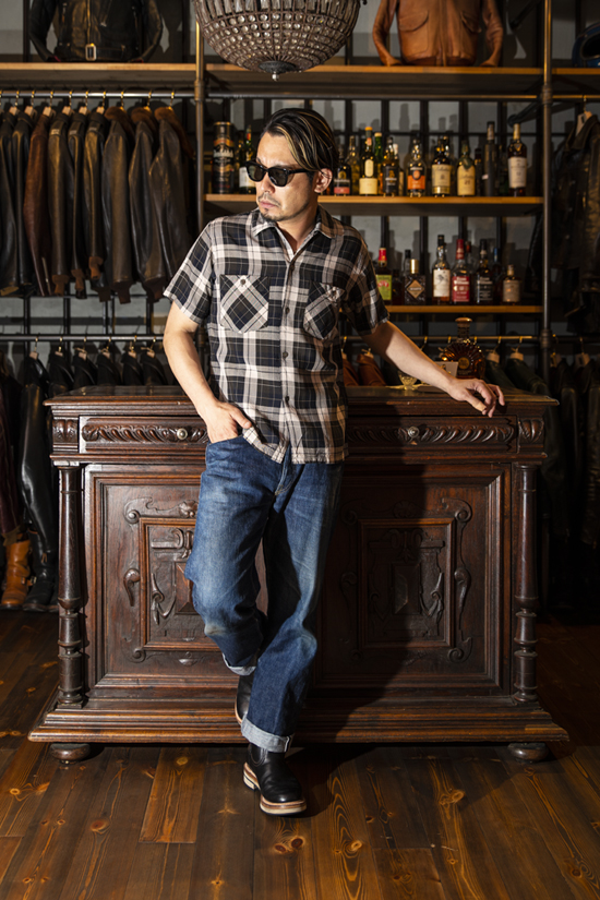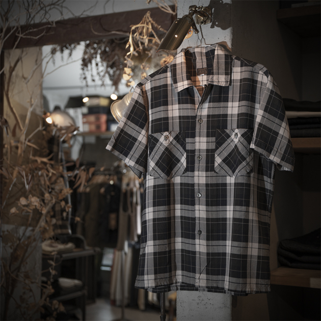 ディテールはオンブレチェックに最もマッチする、オープンカラー(開襟)シャツ型。