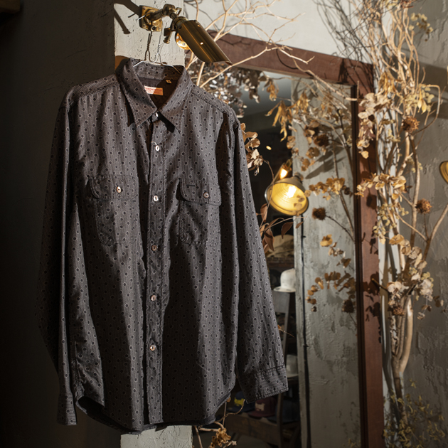 ドレッシーなオーラを持ったファブリックを、敢えて3本針巻縫い仕様のワークシャツで構築するのも面白い。