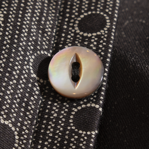 ワークとドレスが融合した表情は、使用されている黒蝶貝猫目ボタンが引き立てます。