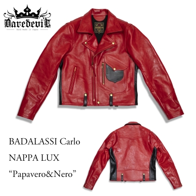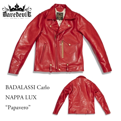 BADALASSIレザーを数多く経験し、その経年変化を熟知したオーナーだからこそオーダーできる仕様と言っていい、Papavero(パパベロ)一色での攻撃的な一着。新品時はこの通りだが、着込む程に濃色へと変化し、落ち着いた発色となる事を充分に想定してのオーダー。