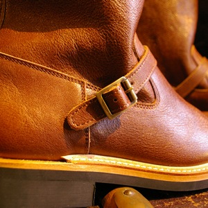 通常、エンジニアブーツのヴァンプ部に取り付けられるストラップ幅は25mm前後のものが多いのですが、今回のこのモデルは15mm幅といったかなり細めの設定