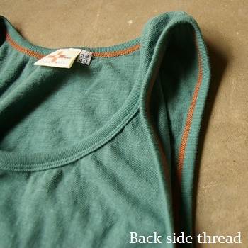縫製糸は、表面は生地と同系の縫製で行い、裏糸にはあえて異色の糸色を使用する事で、タンクトップ自体に動きが出て更にワンポイントにもなる遊び心あるTwo Moonならではの拘り。
