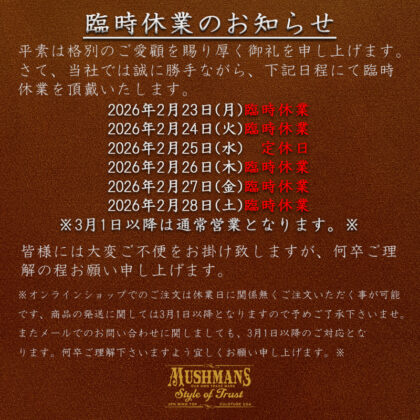 ★MUSHMANSでは2月23日(月)~2月28日(土)の期間で、臨時休業を頂戴いたします。 ご利用の皆様には大変ご不便をお掛けいたしますが、何卒よろしくお願い申し上げます。★ […]
