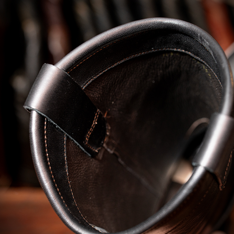 構造で輪郭を閉じ、革の表情で荒々しさを宿す。