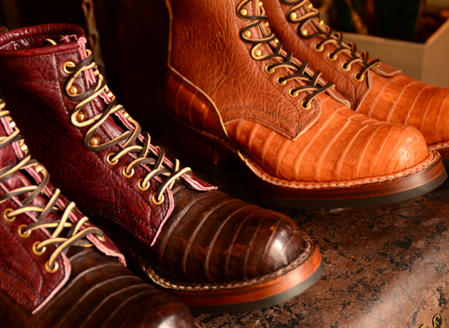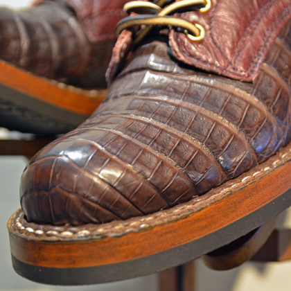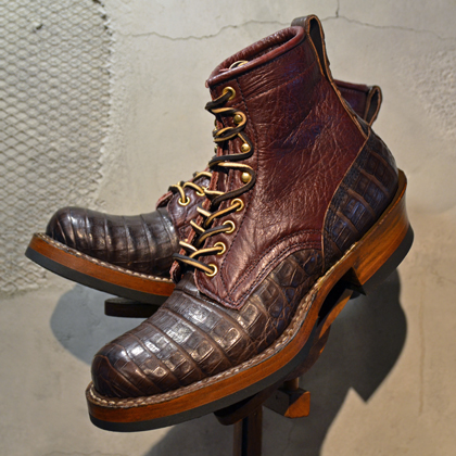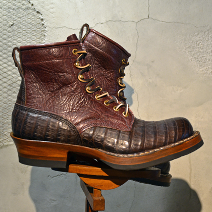 ヴァンプ・ヒールカウンター・バックステイに贅沢にもカイマンレザーを配し、シャフトにはしなやかなブルハイドレザーをセットしております。
