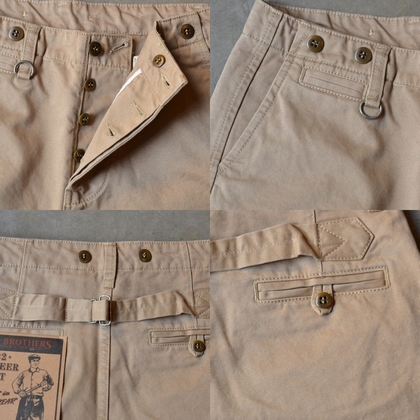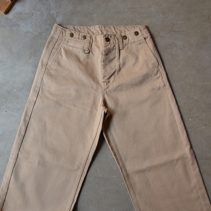 こちらのコットン100% 11ozの【Cavalry Twill/キャバリーツイル】、とても強靭な生地感で、見た目はPIKE BROTHERSの前回のダックパンツに似てますが今回は全く異なる生地感でバックポケットが両玉縁になっていてサスペンダーボタンも本物の象牙ナットで作られたボタン を使用するなど今回のトラウザーもただ者ではないですね!