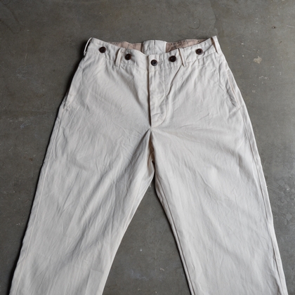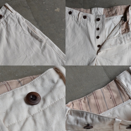 フロントは雰囲気たっぷりの柄入りナットボタンによるボタンフライ仕様でフロント両サイドに飾りステッチ入りのポケットを採用し、腰周りにはこちらも同じく雰囲気たっぷりの柄入りナットボタンを使用したサスペンダーボタンが付き、ベルト帯裏のクラシカルな雰囲気のドビーストライプ生地や、端の部分のパイピング仕上げ等にも拘り、当時同様の非常に凝った裏地仕様を再現しています。