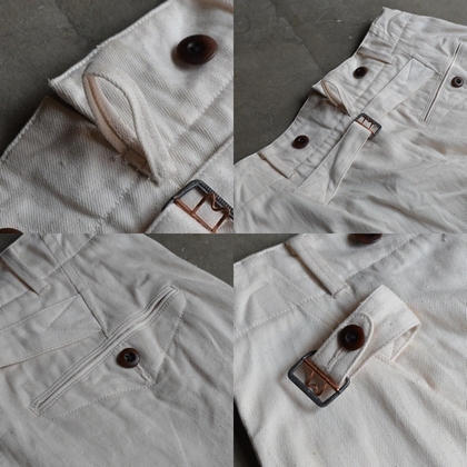 です。経糸にネップを効かせたカツラギを使用することで表情が豊かになり、使いやすい白パンに仕上がっています。古いワークウェアーから再現したこの生地は染色せず、綿花の色をそのまま使用しています。その為、その時期に採取した綿花の色合いを味わえるというのも拘りの一つです。また、染色をしていない為、風合いも柔らかくムラネップ糸とムラ糸のミキシング(交互に糸を織る事)により粗いネップ感をだしています。