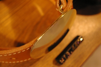 サイズサンプルとして使用しておりましたバックルは、テストサンプルの為BRASS(真鍮)部分は両面テープにて取り付けしておりました。今回は本番仕様ですので御覧下さい