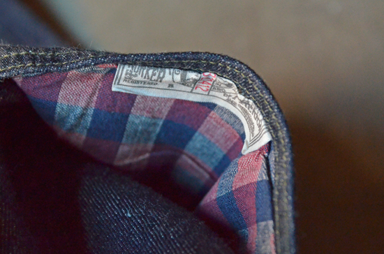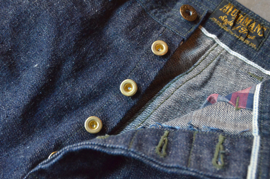* 14 oz. “SC 301″ indigo selvedge denim, cotton and sugar cane fibers, left hand twill, guaranteed to beautify with proper wear