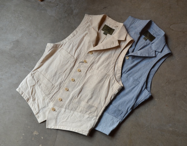 ベストの定番スタイル、マロリーベストのスソ部分を別布で切り替えたデザイン。