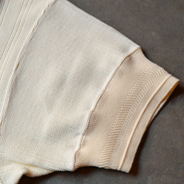 編み立てた袖リブや背当て、貝ボタンなど古き良きアンダーウェアのディテールを取り入れ、