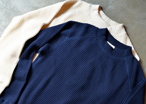 特殊な編み機で編んだふんわりとボリュームのあるコットンサーマル生地を使用したアイテム。
