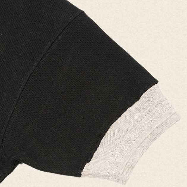 襟周り、袖リブには別途編み立てた横付属を使用し、前立てには天竺を使用しております。