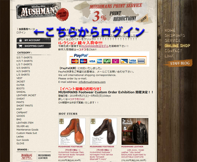 が、いつもMUSHMANS ONLINE SHOPをご利用いただいているお客様は、オンラインショップ左上からログインしていただき、その後商品ページを御覧いただきますと今回限定のスペシャルプライスが表示されるように設定してあります。