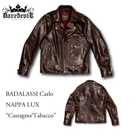 BADALASSIレザーを数多く経験し、その経年変化を熟知したオーナーだからこそオーダーできる仕様と言っていい、Papavero(パパベロ)一色での攻撃的な一着。新品時はこの通りだが、着込む程に濃色へと変化し、落ち着いた発色となる事を充分に想定してのオーダー。