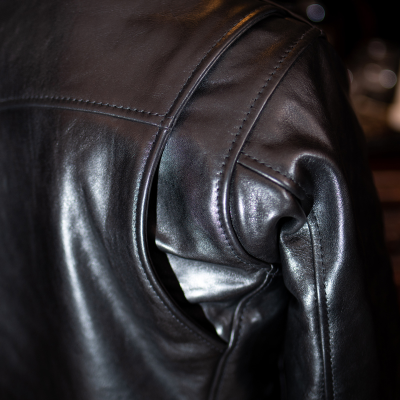 重厚なレザーマテリアルを使用しても、窮屈さを感じる事なく着こなしていただけるジャケットになっている。