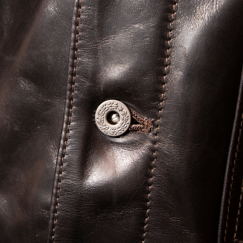 今作においては、これまでドットボタン仕様であったフロントボタンを、ボタンホール仕様とする事で、よりオールドな雰囲気を持たせた。