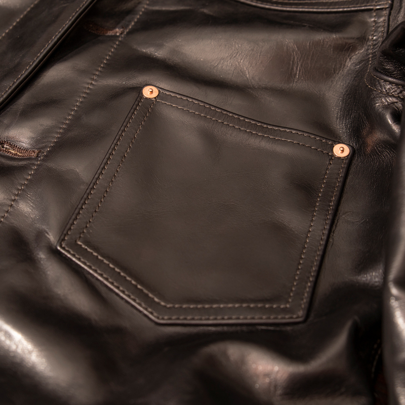 つまり、デニムジャケット(Gジャン)っていうのは、デニムファブリックだからカッコイイ訳で、そのままデザインをまるパクりするんじゃ芸が無い。という個人的な見解から、その雰囲気をレザーでやるなら『こうありたい。』という想いが入っている。