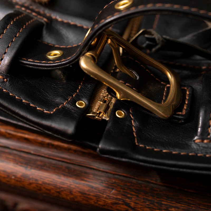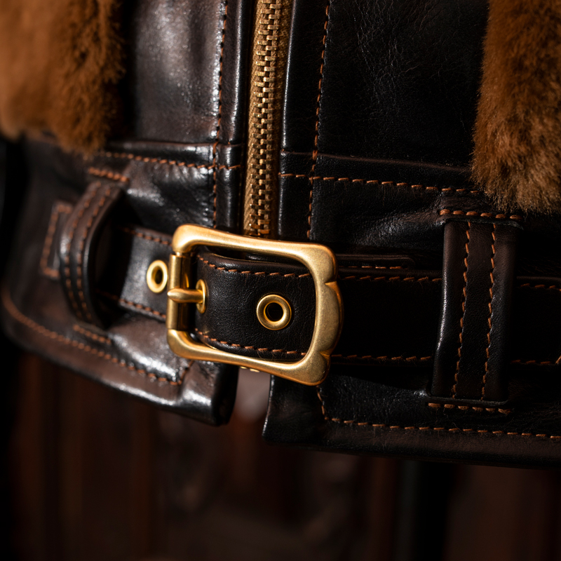1930年代のグリズリージャケットの時代背景とマッチするよう、アールデコ調のバックルを使用。