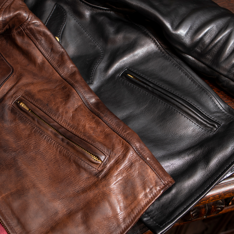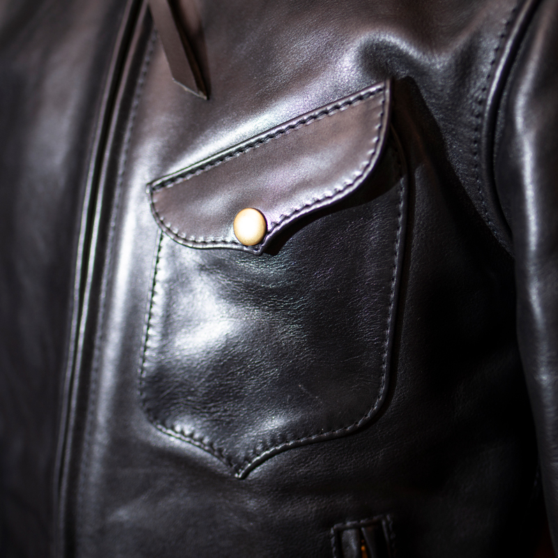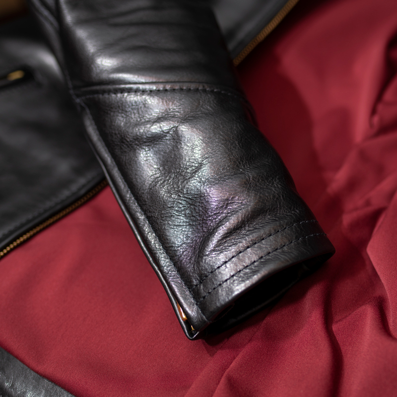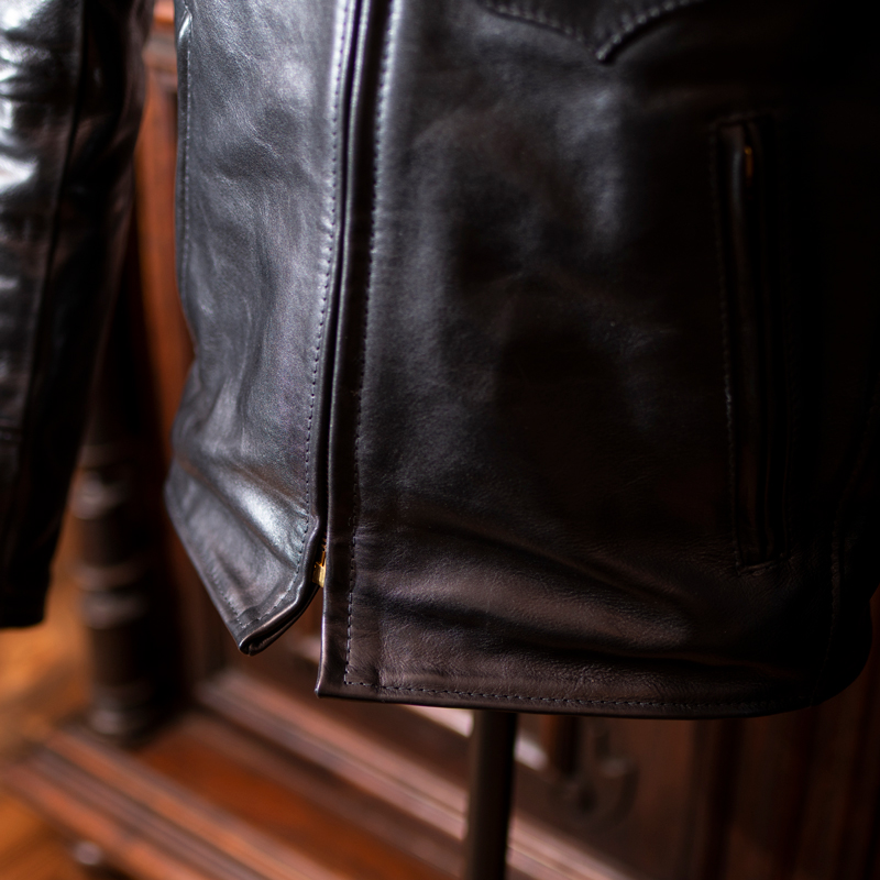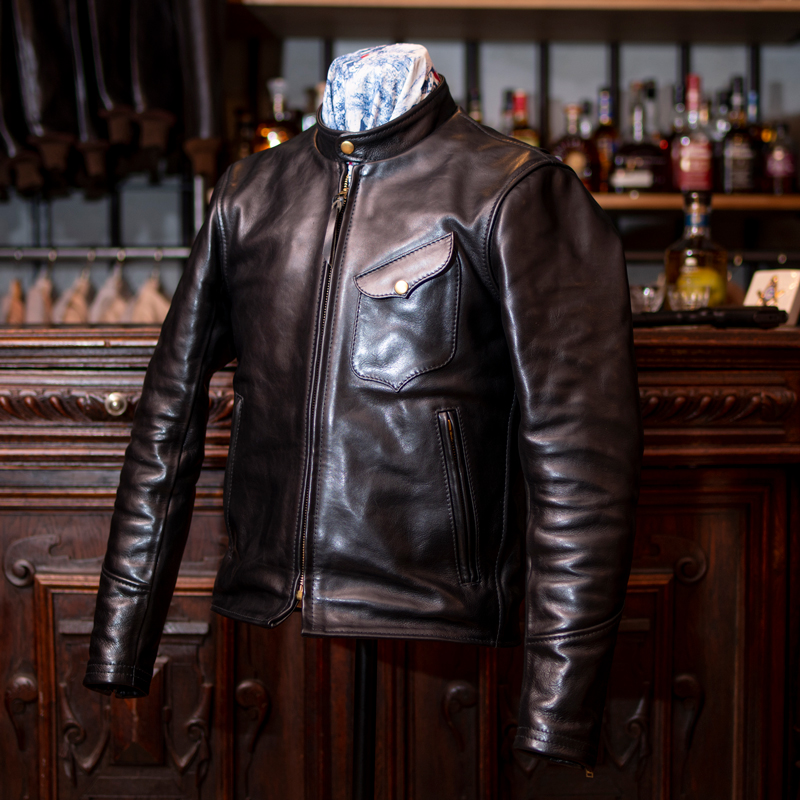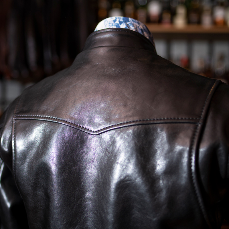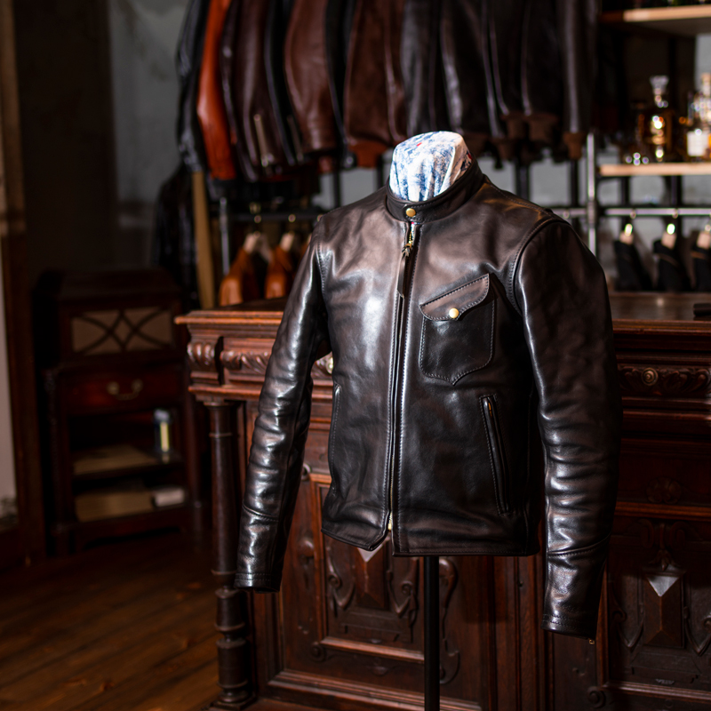 スタンドカラーシングルライダースとして、非常にバランスの良いシルエットとなっている。