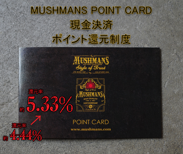 つきましては、微力ながらMUSHMANSでも、このキャッシュレス・ポイント還元事業の実施期間に合わせまして、店頭でのポイント制度において、現金決済のお客様に向けての独自ポイント還元施策を実施いたします。