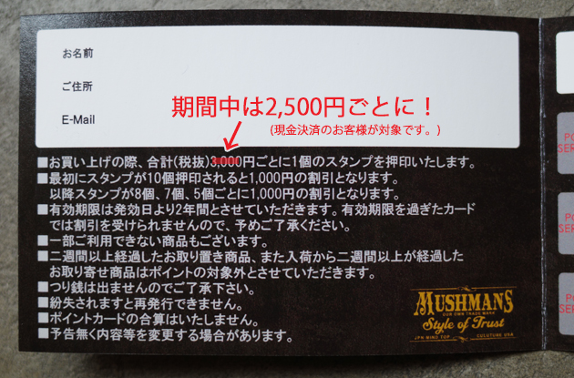 MUSHMANS店頭現金決済ポイント還元制度は、1ポイントの付加を2,500円に引き下げます。