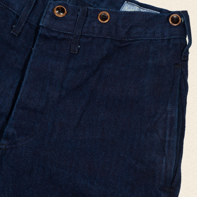 現状新品時では、かなり濃色のファブリックではございますが、数回ウォッシュをしていただきますとヘリンボーンツイルの柄が現れてくる事でしょう。