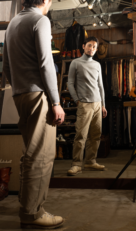 しっかりとしたサーマル地を使い、着回しの良いタートルネックを仕立てています。