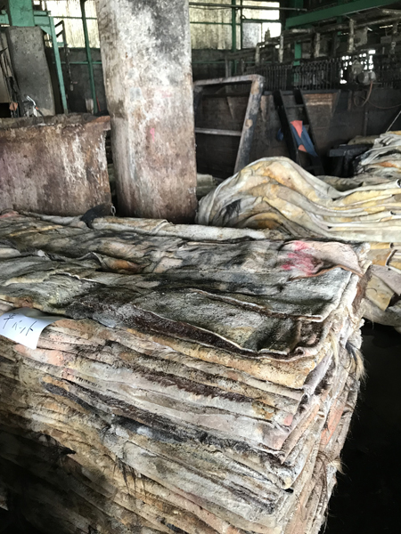 輸入された段階、塩漬けの状態で積まれた馬革原皮。