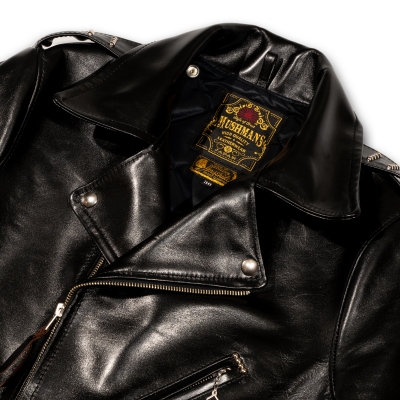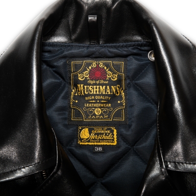襟裏にはMUSHMANS Leatherラベルと、GENUINE HORSEHIDEラベルが装着されます。