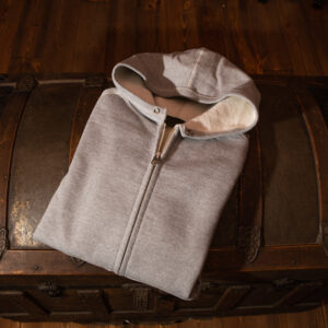 首元、袖口、裾はオーバーロックで縫製後、3本針両面飾りミシンでカバーリングし、カン止めを打つ事でほつれを防止しております。