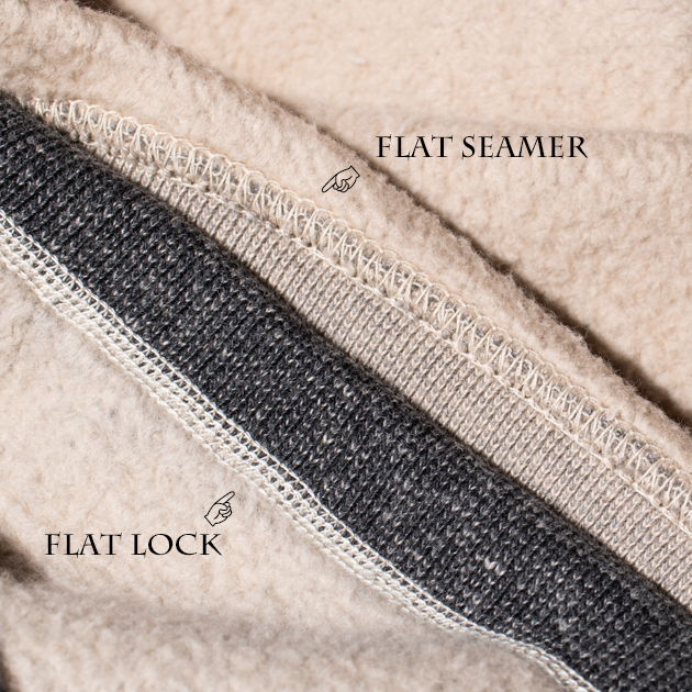 上糸4本・上糸飾り1本・下糸4本の計9本の糸で縫製されるフラットロックは比較するとさらに滑らかな縫製面に仕上がります。