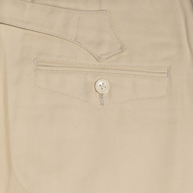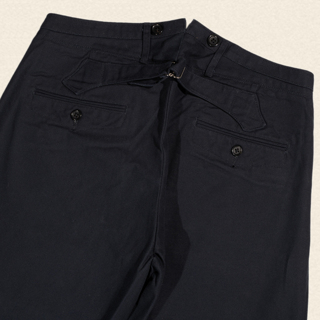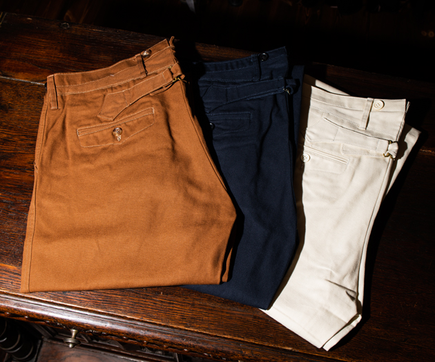 1910年〜20年代のスラックスをベースにしたアイテムで、ハイバックや独特なヨーク切り替えはクラシックなトラウザースによく見られます。