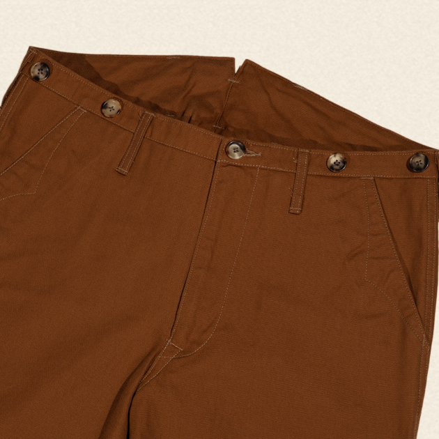 1900年代初頭のパンツに多く見られる尾錠も、クラシックな雰囲気を醸すポイントです。