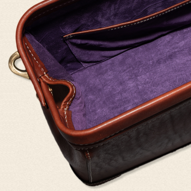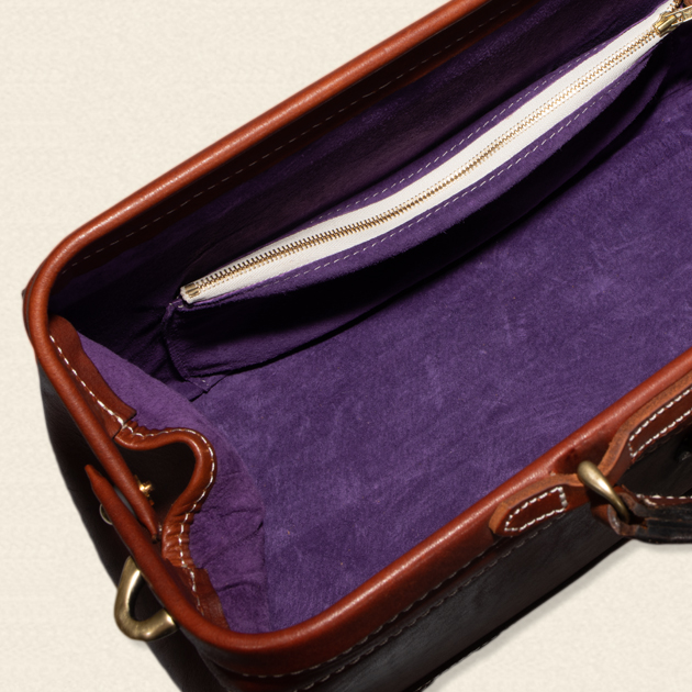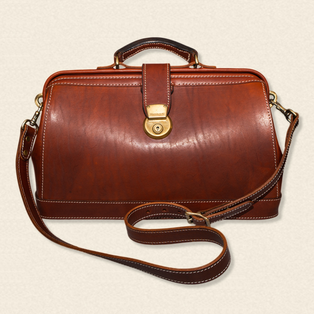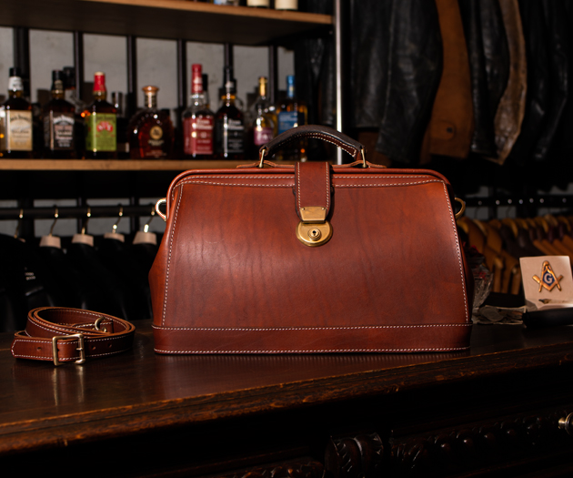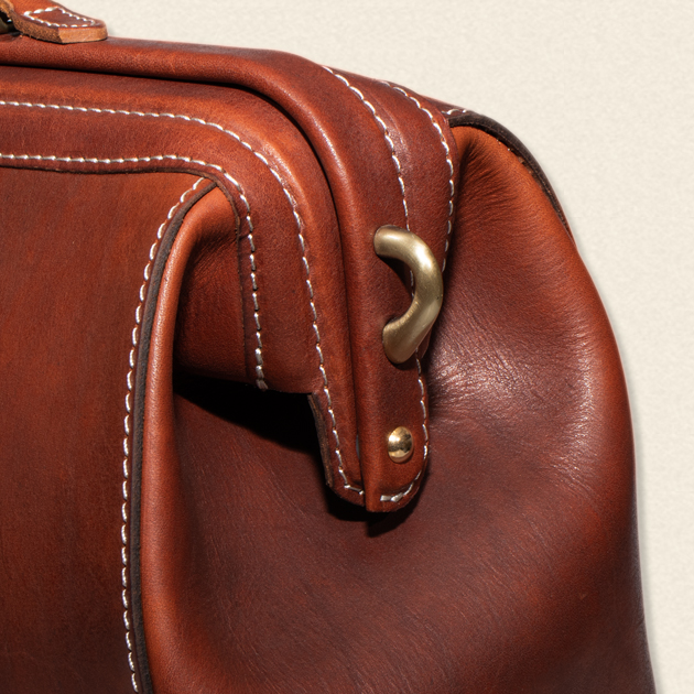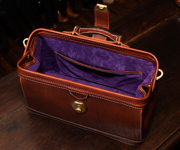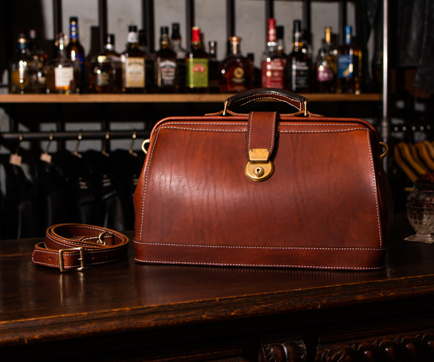 ドクターバッグの特徴は、開口部が口金式で大きく開き、側面が山型になっているところ。