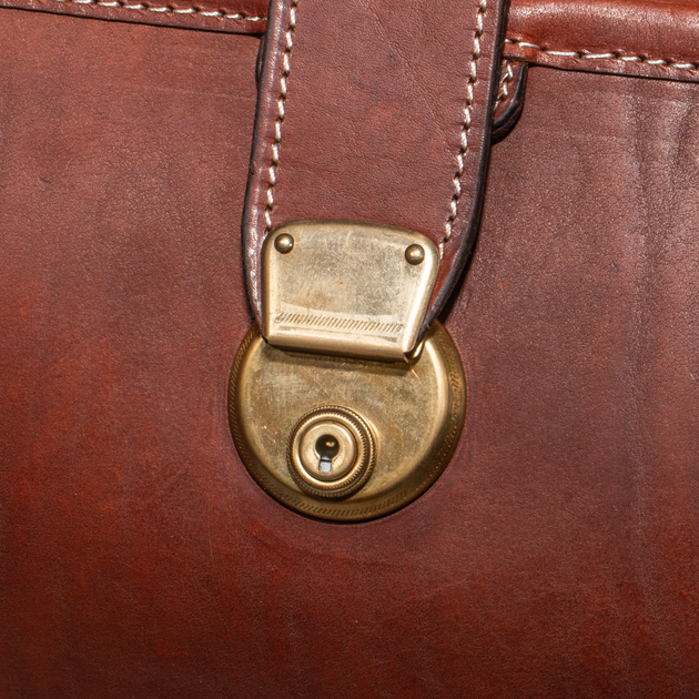 ドクターバッグには鍵穴がついている物も存在しますが、本品のはフェイクで円形の突起を下げることで開くことができます。