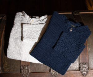 ポリウレタン糸を綿糸でカバーリングしたストレッチ天竺素材を使用し、カットソーと同じ天竺素材ながら自然と度目が詰まったハリコシのある生地に仕上げております。