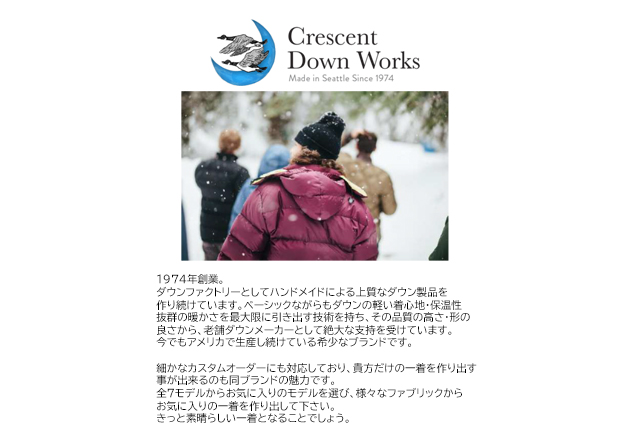 1974年にアン・マイケルソンによって設立されたCrescent Down Worksは実に40年以上に渡って、ダウンアイテム作り続けるブランド。